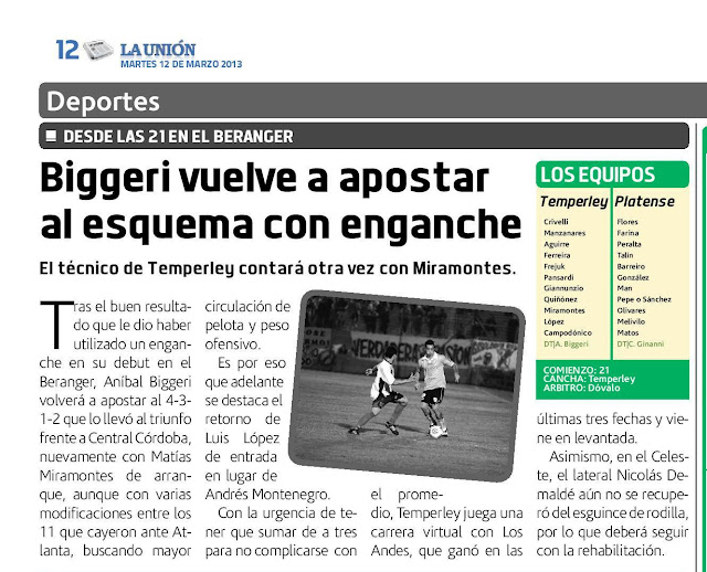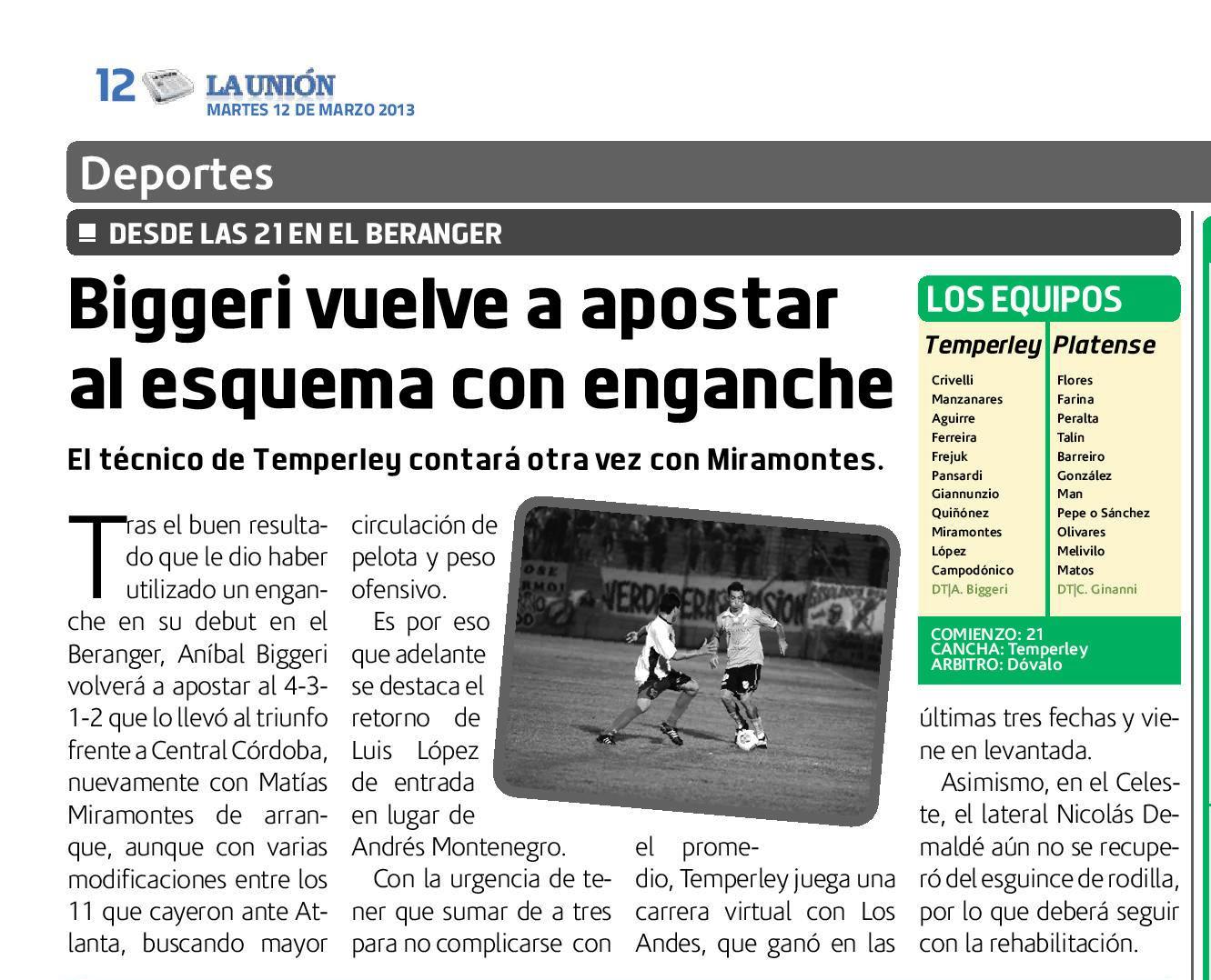 DIARIO LA UNIÓN - TEMPERLEY RECIBE A PLATENSE DESDE LAS 21 HS - 12/3/13