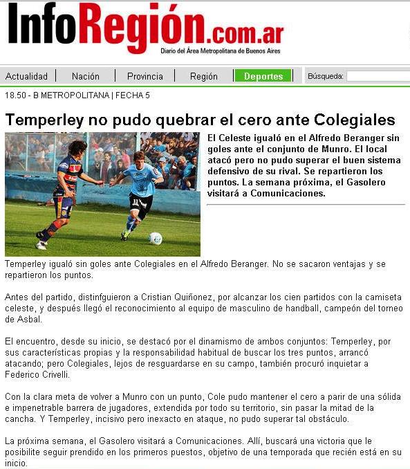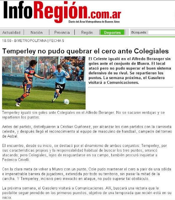 INFOREGIÓN - TEMPERLEY EMPATÓ ANTE COLEGIALES - 1/9/13