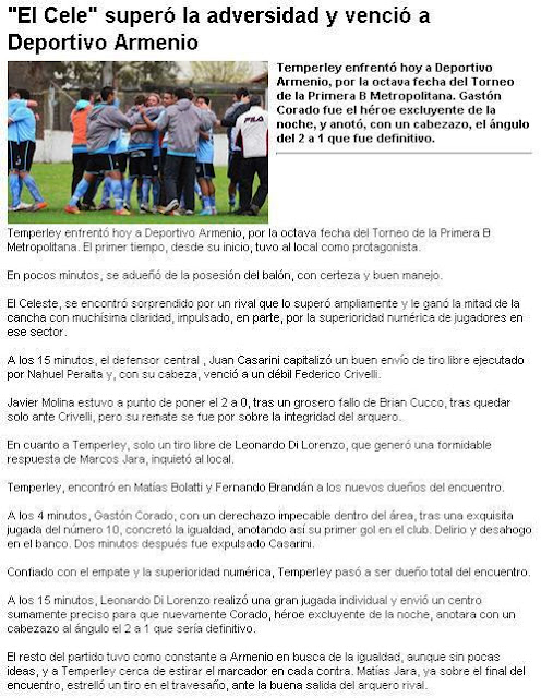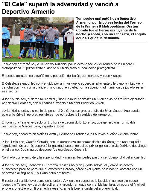 Temperley enfrentó hoy a Deportivo Armenio, por la octava fecha del Torneo de la Primera B Metropolitana. Gastón Corado fue el héroe excluyente de la noche, y anotó, con un cabezazo, el ángulo del 2 a 1 que fue definitivo.