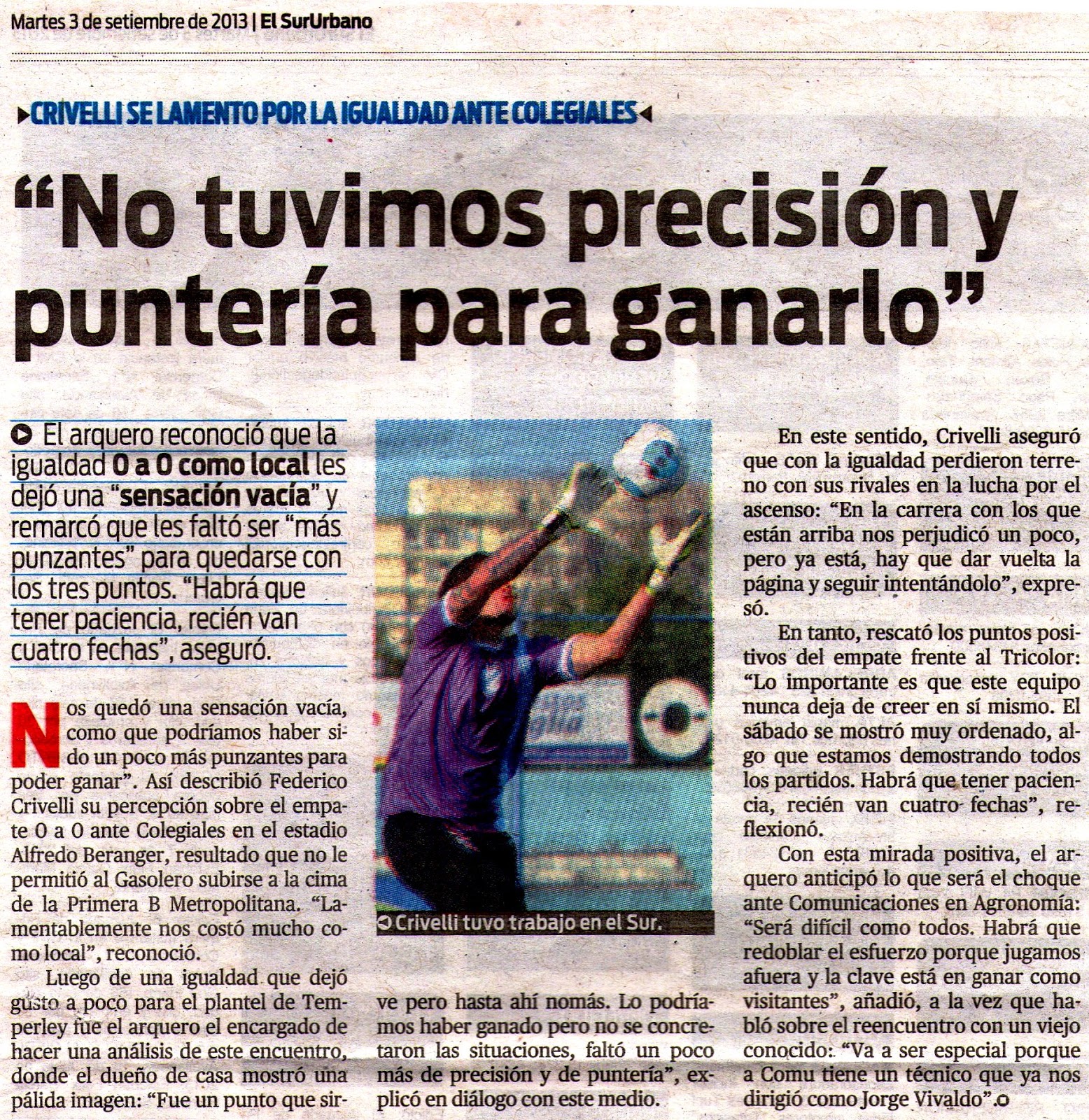 POPULAR - DECLARACIONES DEL ARQUERO DE TEMPERLEY LUEGO DEL EMPATE ANTE COLEGIALES - 3/9/13
