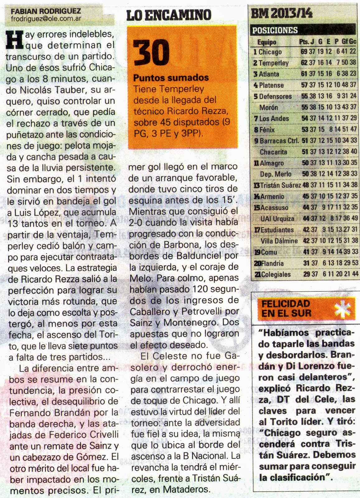 DIARIO OLÉ - TEMPERLEY 2 / CHICAGO 0 - 12/5/14