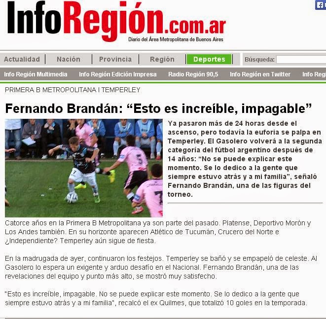 Ya pasaron más de 24 horas desde el ascenso, pero todavía la euforia se palpa en Temperley. El Gasolero volverá a la segunda categoría del fútbol argentino después de 14 años: “No se puede explicar este momento. Se lo dedico a la gente que siempre estuvo atrás y a mi familia”, señaló Fernando Brandán, una de las figuras del torneo.