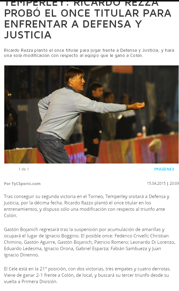 TYC SPORTS - REZZA PREPARA LA FORMACIÓN PARA ENFRENTAR A DEFENSA - 15/4/15