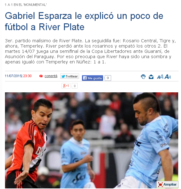 3er. partido malísimo de River Plate. La seguidilla fue: Rosario Central, Tigre y, ahora, Temperley. River perdió ante los rosarinos y empató los otros 2. El martes 14/07 juega una semifinal de la Copa Libertadores ante Guaraní, de Asunción del Paraguay. Por eso preocupa que River haya sido una sombra y apenas igualó con Temperley en Núñez: 1 a 1.