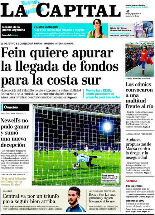 Al minuto el árbitro Mariano González cobró un penal contra Maxi Rodríguez que él solo vio. Claramente pudo verse cómo a La Fiera lo bajaron unos 30 centímetros fuera del área. Sin embargo, Maxi no estuvo fino y el arquero Crivelli contuvo abajo.