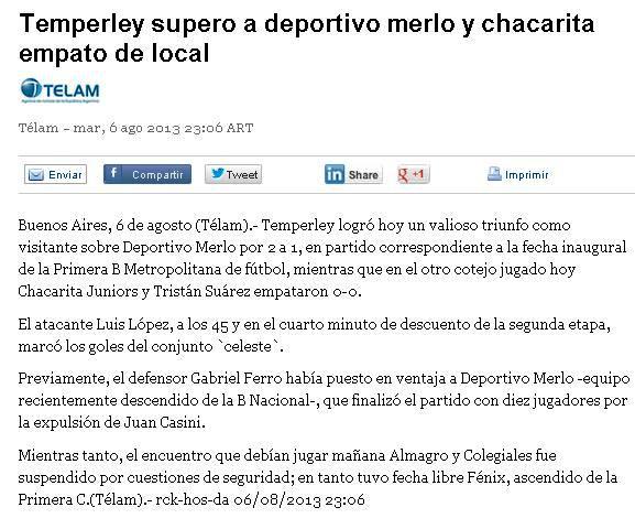 TÉLAM A TRAVÉS DE YAHOO - TEMPERLEY LE GANÓ A MERLO - 6/8/13