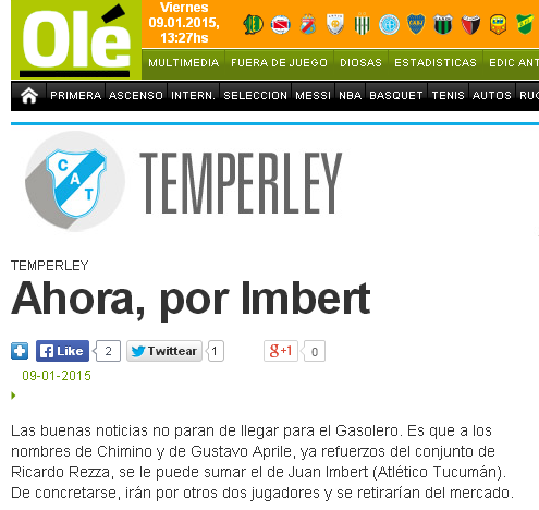 OLÉ - TEMPERLEY BUSCA EL TERCER REFUERZO - 9/1/15
