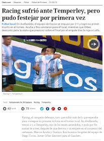 Racing, el campeón defensor, tuvo que sufrir más de lo que esperaba para conseguir su primera victoria en el torneo local. En Avellaneda, venció 2-1 a Temperley, uno de los recién ascendidos, y pudo por fin sumar de a tres, después de una derrota y un empate en el comienzo del certamen. Marcos Acuña y Gustavo Bou hicieron los goles del equipo de Diego Cocca. Javier Grbec descontó para el Gasolero.