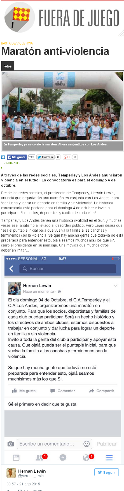 A través de las redes sociales, Temperley y Los Andes anunciaron que organizarán una maratón en conjunto para luchar contra la violencia en el fútbol. La convocatoria es para el domingo 4 de octubre.